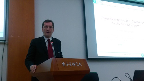 报告会首先由中科院电子所洪文研究员代表承办方致辞,欢迎Adriano Camps教授和各位代表莅临电子所;然后由IEEE北京办公室尹嫱博士介绍了IEEE GRSS分会;最后加泰罗尼亚工业大学Adriano Camps教授做学术报告“小卫星与对地观测:UPC NanoSat计划”。报告会由《雷达学报》编辑部主任贾守新主持。