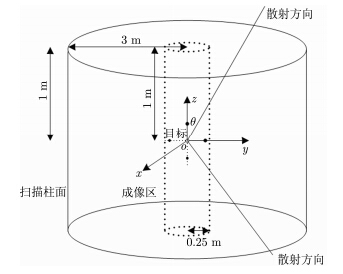 近年来出现了一种基于近场成像的目标RCS测试新方法[8, 9]。该类方法先得到目标的雷达散射图像,雷达散射图像表示目标的等效散射中心分布,再通过这些局部等效散射中心的散射场叠加获得远处散射场,最后根据散射截面的定义得到目标的RCS值。目前的文章基本上都是讨论单站圆迹近场成像的RCS测量原理[10, 11, 12],与传统的近场测量方法相比,新的近场测量方法除能得到RCS值外,还可获得目标的雷达散射图像,而且数据处理也较为简单,但圆迹扫描亦有其缺点:(1)只能得到2维圆迹平面角域上的RCS值,无法得到3维立体角域的RCS值;(2)对被测体目标的垂直尺寸(与圆迹平面垂直方向上的尺寸)有一定的限制[11],如果被测目标的垂直尺寸(与圆迹平面垂直方向上的尺寸)较大时,圆迹扫描是不够的,需进行圆柱扫描才能获得较为可靠的远场RCS值。较少文献涉及基于圆柱扫描的RCS测试研究[13]。文献[13]针对圆迹扫描的第2个缺点,通过简单的变量代换直接给出一种3维聚焦函数,该聚焦函数要求定标体必须位于成像的中心位置上,如果不在中心位置上,则无法使用文献[13]的相关公式,因此其聚焦函数缺乏通用性。此外,文献[13]得到的仍是2维圆迹平面角域的RCS值,基于以上两点其缺乏实用性。本文以理想的点散射中心模型(即假设目标是由各向同性的等效散射中心组成)为核心假设,通过详细的理论推导给出了一种具有通用性的基于柱面扫描近场成像的RCS测量方法,该方法对定标体的位置没有严格要求,而且能得到目标的3维立体角域的RCS值。本文结构安排如下:第2节着重提出一种基于柱面扫描3维近场成像的RCS测量方法;第3节给出仿真结果,验证了方法的可行性;第4节则是全文的总结。