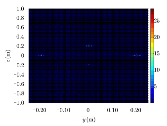 雷达散射图像是获得目标RCS值的中间参量,本文的侧重点在于目标的RCS值而非散射图像,所以在此仅给出目标在yoz平面的散射图像相对分布图(非绝对分布图,这并不影响后面的RCS值,因为还有定标体校准这一步骤),如图 4所示。