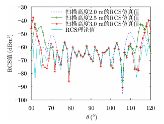 图 6 RCS理论值与不同扫描高度下的RCS仿真值 Fig.6 RCS theoretical results and simulated results of different scanning height |
