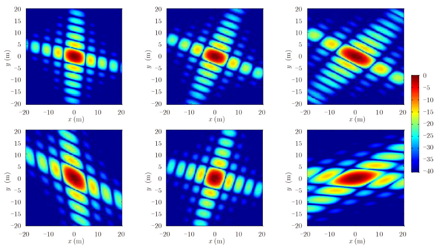图 10 Geo-CSAR 2维成像模式下,位于东经110°,北纬19°(海南)的点目标的点扩展函数 (从左至右分别为第10,15,20,36,41和46幅序列图像)Fig. 10 The spread function of the point target located at East 110°,North 19° (Hainan) of the Geo-CSAR 2-D imaging mode. (The sequences are 10,15,20,36,41,46 respectively) |