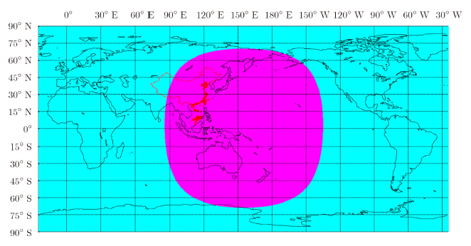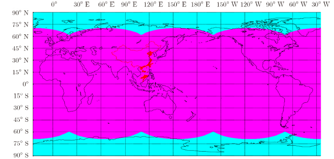 3维成像模式下,可在每组卫星中任选1颗,共4颗,对4颗卫星的24 h可视范围进行叠加,得到如图 14所示的3维成像覆盖区域(紫色),覆盖率达到地球表面总面积的92%,非覆盖区(青色)处于两极。