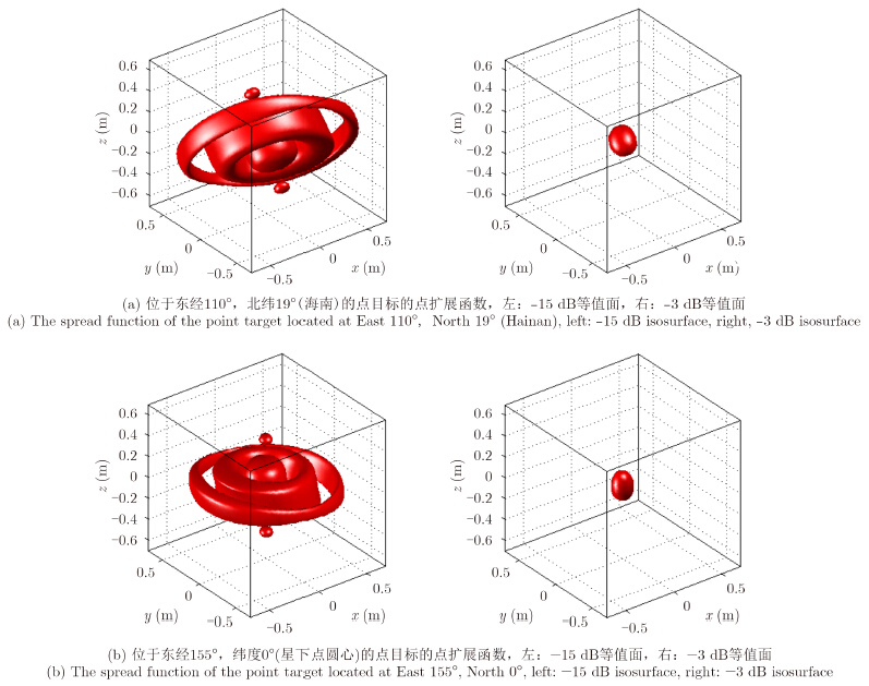 为更直观地展示单颗Geo-CSAR的3维成像能力,下面以位于东经110°,北纬19°(海南)处的点目标和东经155°,纬度0°(星下点圆心)处的点目标为例,给出它们360°全孔径合成的3维点扩展函数。