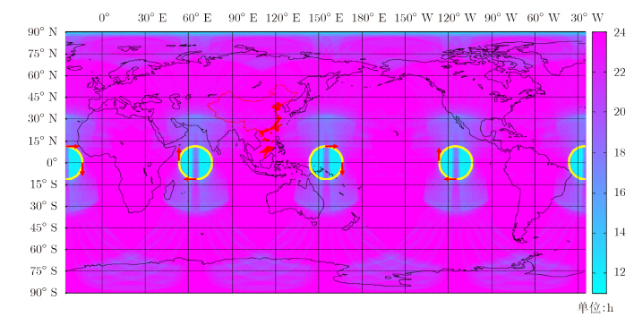 图 13还给出了满足2维成像指标要求的地球表面时间覆盖度,其观测能力为:地球表面的瞬时覆盖范围超过86%,最高时可达96%;约35%的地球表面能够实现不间断观测;另约28%的地球表面观测间隙不超过1 h;另约29%的地球表面的观测间隙不超过5个小时;另约8%的地球表面(两极和星下点部分区域)的观测间隙不超过12 h。