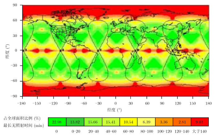 ![]() | 图 13 8颗卫星协同工作时,达到指标要求的地球表面时间覆盖度Fig. 13 The time coverage of the land surface in view for a constellation of 8 satellites with the given imaging performance requirments |