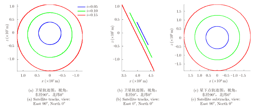 图 4给出了地心惯性直角坐标系下,满足以下条件:a=A,i=2e,ω=π/2, Ω=G,不同轨道倾角i的Geo-CSAR卫星轨迹。从图中可以看到,卫星轨迹位于赤道上方,在空间中近似为斜椭圆,且关于经线λ0对称,星下点轨迹近似为圆,随着轨道倾角的增大,轨迹半径不断增大。