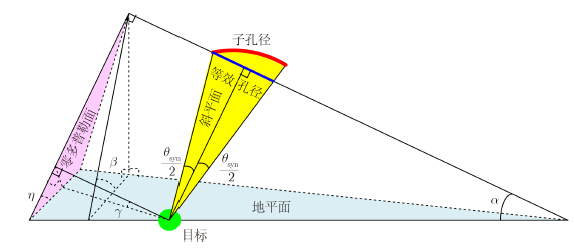 我们更关心的指标是地平面分辨率,该指标能更准确地反映SAR系统对地面目标的分辨能力。与低轨星载SAR相比,Geo-CSAR的成像几何更为复杂,地平面分辨率的计算需要考虑Geo-CSAR成像孔径相对于观测目标的实时几何关系。图 5给出了成像孔径与地面目标之间的几何关系,其中,角度 β表示斜平面与地平面的夹角,角度α表示有效孔径与斜平面-地平面交线之间的夹角。