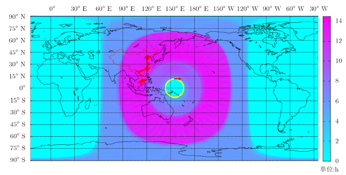 3维成像模式下,24 h全孔径合成,全孔径相对于地面目标的视角变化约为2i,本参数下,视角变化约为23°,可以认为目标的散射特性在整个孔径内保持恒定,具备真3维成像的条件。因全孔径相对于地面不同位置处的目标视角变化范围差别不大,则3维分辨率的空变性也不大,根据式(17)和式(19)计算得到:平面分辨率约为0.33 m,高程分辨率约为0.3 m,本文以此作为3维成像模式的指标。图 11给出了满足指标要求的覆盖区域(紫色),覆盖率为地球总面积的33%。