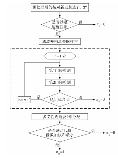 对满足速度匹配的新老航迹逐对做统计双门限航迹段关联判决,有满足双门限的老航迹${{\mathbf{T}}^{i}}$和新航迹${{\mathbf{T}}^{j}}$,将关联矩阵中的元素${{\pi }_{ij}}$赋值1,对于不满足双门限的新老航迹,将关联矩阵中的元素${{\pi }_{ij}}$赋值0。