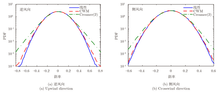 图 1对风速7 m/s时线性海面、CWM海面和Creamer(2)海面的斜率统计分布特性进行了比较。由图 1可见,受非线性作用的影响,Creamer(2)海面和CWM海面中海浪出现陡峭波面,即大斜率波浪的概率高于线性海面,且Creamer(2)海面中较大斜率出现的概率最高。特别指出,由于CWM海面采样间隔不均匀,本文利用随机过程的特征函数与PDF互为傅里叶变换对的性质,基于特征函数求得了这3种海面的斜率统计分布曲线。此外,由图 1还可看到2维海面沿逆风向的轮廓较沿侧风向的轮廓更容易出现较大的斜率,即2维海面沿逆风向的波浪形状更为尖锐。