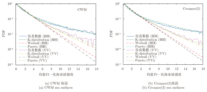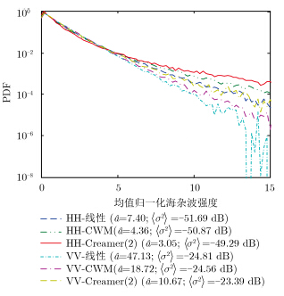 极化下更容易出现满足海尖峰散射强度要求的散射点。图 6为相同仿真条件下,3种海面宽带回波信号强度的统计分布曲线。在图 6中,可观察到Creamer(2)海面在远大于回波强度均值处具有最大的PDF值,其长拖尾现象最严重。而线性海面在回波强度较大值处的PDF值最小,对应的形状参数也最大。由电磁散射理论可知,海面的电磁散射强度会随着入射角的增大而减小,特别是在HH极化下。相同仿真条件下,非线性海面的波峰更为陡峭,这使得非线性海面中波峰附近的局部入射角小于线性海面中同一波峰附近的局部入射角,继而导致非线性海面中此位置附近的电磁散射强度增大。注意到非线性海面中出现斜率较大的波面概率更大,因此,非线性海面中更容易出现强散射点。由于Creamer(2)海面中出现大斜率波浪的概率最大,因而Creamer(2)海面中的尖峰现象最为显著。