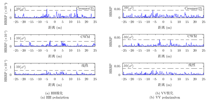 为比较海面模型对海杂波散射特性的影响,图 5对同组随机数仿真得到的线性海面、CWM海面和Creamer(2)海面的1维距离像进行了对比。图 5中海面上空风速为7 m/s,雷达入射角为80º,入射方向为逆风向。图 5中虚线为海尖峰强度检测阈值,定义为10倍的海杂波强度均值[20]。由图 5可见,相同条件下,Creamer(2)海面中强散射点现象最明显,而线性海面回波信号中强散射点现象最弱。同时,HH极化下仿真所得海面回波信号较VV