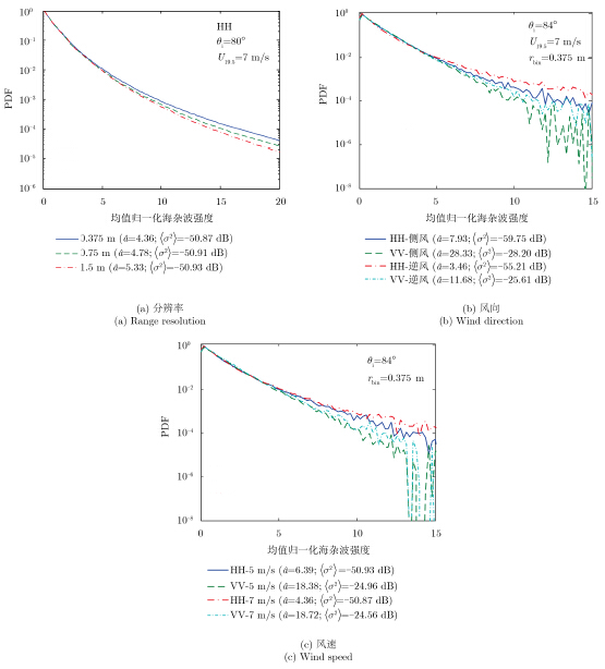 图 7(a)-图 7(c)以CWM海面为例,分别比较了雷达分辨率、风向和风速对海杂波强度统计特性的影响。图 7(a)中雷达入射角为80º,海面风速7 m/s,风向为逆风,极化方式为HH;图 7(b)中雷达入射角为84º,风速7 m/s,分辨率0.375 m;图 7(c)中雷达入射角为84º,风向为逆风,分辨率0.375 m。由图 7可见,随着雷达分辨率的提高、风向由侧风转向逆风、风速的增加,海杂波强度PDF的长拖尾现象更加明显,基于Pareto模型估计所得的海杂波强度PDF的形状参数也随之减小。这与Toporkov等人[6]对1维海面宽带散射特性进行仿真和对实测数据进行分析得到的结论[21]一致。