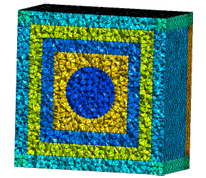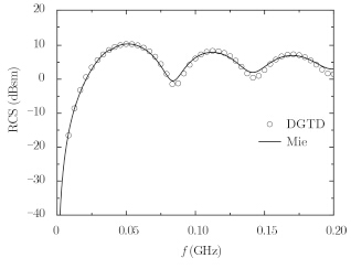 4 算例为说明本文算法的正确性,用DGTD方法计算半径为1 m的金属球的后向RCS并与解析解结果相对比。计算区域被离散成为319308个四面体(计算域剖分截面图如图 4所示),空间离散尺度为0.15 m,采用1阶Mur吸收边界。图 5是金属球后向单站RCS的计算结果(圆圈),作为比较,图中还给出了Mie级数计算结果(实线),由图可见两者的结果吻合较好。本算例DGTD消耗内存约280 MB,计算耗时约20 min,计算平台为Intel Core i5 3470;采用FETD计算所需内存消耗为2 G,计算时间在6 h以上。显然,本文方法有更高的计算效率。