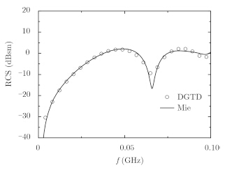 设介质球参数为e=4e0,m=m0,s=0.00015 S/m,其余参数同上。图 6是本文方法(圆圈)与Mie级数计算结果(实线)的比较,由图可见,两者相吻合。
