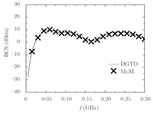为说明本文算法对于计算较为复杂目标的适用性,下面计算金属弹头的后向RCS。弹头模型如图 7所示(底面半径为1 m,高为2 m)。电磁波沿z轴负方向,电场沿x方向极化入射。图 8为弹头的后向RCS,实线为DGTD算法的结果,斜十字为MoM算法扫频结果。由图可见,两种算法的结果符合较好。
