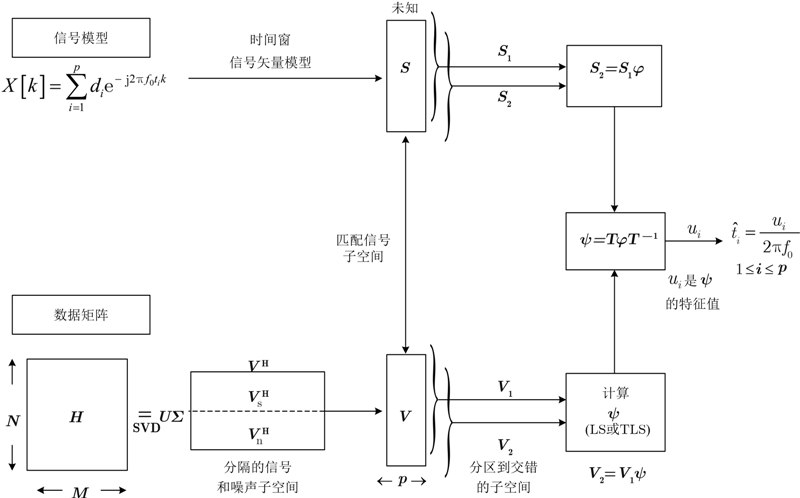对矩阵S2: S2=V2T=V1yT,S2=S1j=V1Tj,那么yT=Tj,y=TjT-1。由于y与j有相同的特征值,j的特征值就是对角元素{ui}i=1,···,p。求解y的特征值,就能得到时间估计是:${\hat t_i} = \frac{{ - \angle {u_i}}}{{2{π} {f_0}}}$。同样,再由$X\left[k \right] = \sum\nolimits_{i = 1}^p {{d_i}{{\left( {{u_i}} \right)}^k}} $即可计算出信号的幅度di。