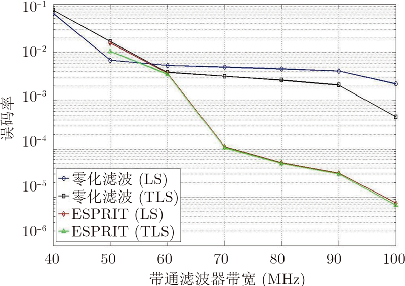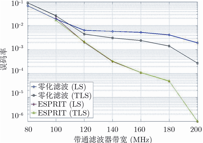 从图 3和图 4中可以看出,尽管ESPRIT算法所需的带通滤波器的最小带宽要比零化滤波算法大,但是在能够允许的相同带通滤波器的带宽下,ESPRIT算法的误码率性能要明显好于零化滤波算法,并且带宽越宽,ESPRIT算法的性能就越好。