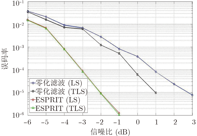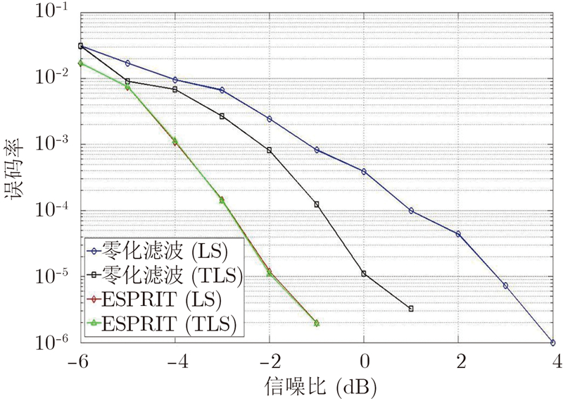 从图 5和图 6中可以看出,ESPRIT算法的误码率性能比TLS解的零化滤波算法要高出2 dB,比LS解的零化滤波算法要高出4 dB。在图 3~图 6中,我们发现ESPRIT算法在LS解和TLS解方面的性能差别几乎没有,原因是在零化滤波算法中,TLS解同时考虑了不同时刻信号的噪声,LS解只考虑了某一时刻信号的噪声;在ESPRIT算法中则进行了噪声维度的设定,在设定噪声维度的时候就考虑了不同时刻信号的噪声。从第3节中的ESPRIT的LS和TLS的计算过程上看,LS解的计算量要明显少于TLS解,因此,ESPRIT算法的LS解的应用前景较大。