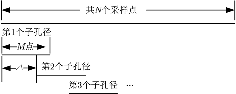 3.2 子孔径划分与方位向FFT将方位向位置x写成离散化形式,按照图3在方位向进行子孔径划分。假设全孔径总长度为N点,划分为S个子孔径,每个子孔径长度为M点,相邻子孔径间重叠点数为)$\left( {M - \Delta } \right)$个,则有: