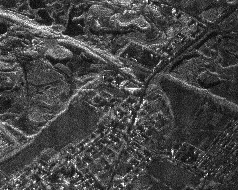 图 6是某无人机载SAR原始数据利用高速实时专用信号处理平台的实时成像结果。SAR系统参数与成像参数与点目标仿真参数相同,具体如表 3所示。通过对实测数据的成像结果表明,实时成像处理速度满足系统实时性要求,成像处理结果满足系统对图像质量的要求。本文描述的适用于距离向脉冲压缩条带SAR的OSA算法能够应用于中小型无人机载SAR系统的实时成像处理器。