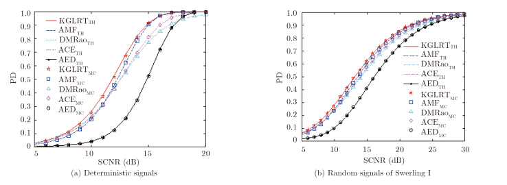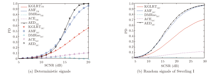 5.1 AEDIn this subsection,we compare the detection performance of the AED with some well-known detectors,namely,the KGLRT,AMF,ACE,and DMRao. Precisely,we compare their PDs for the deterministic,random,matched,and mismatched signals. As for the random signal,only the Swerling I fluctuation model is considered.