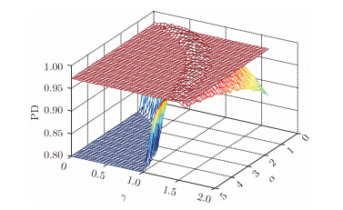 Fig. 3 shows the PD of the MEAKW with different tunable parameters,also in comparison with the KGLRT (i.e.,the plan shown in Fig. 3). For convenience,the values of the PD of the MEAWK less than 0.8 are set to be 0.8. It is shown that with many pairs of tunable parameters a and g,the MEAWK can provide a higher PD than the KGLRT.