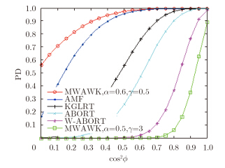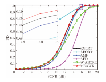 The detection performance of the MEAWK,with specific g and a,under different SCNRs is displayed in Fig. 4. The results highlight that the MEAWK can provide a higher PD than the other detectors for all the values of the SCNR in the interval between 8 dB and 16 dB.