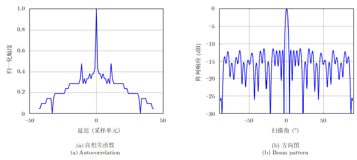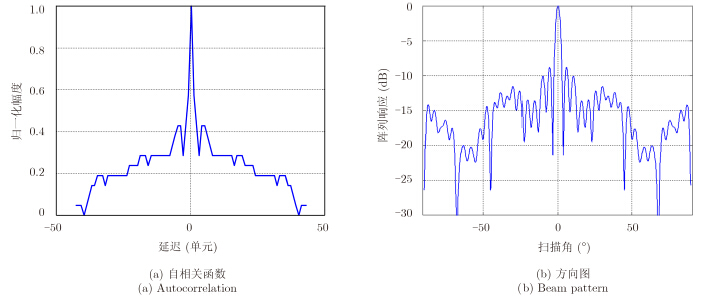 图 2 44位巴克码自相关与方向图情况(11×4) Fig.2 Autocorrelation and beam pattern of 44 bits combined Barker code(11×4) |