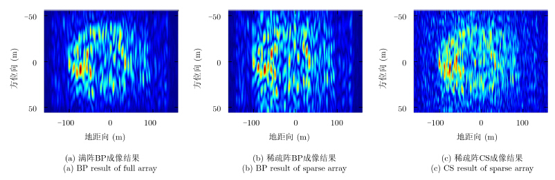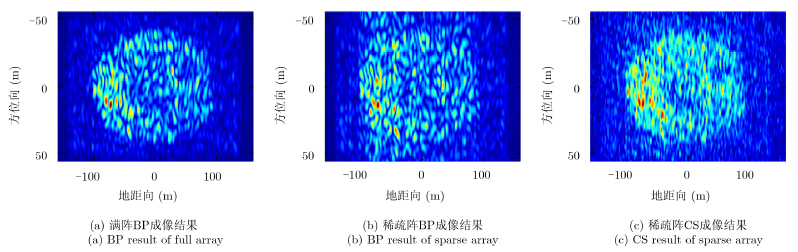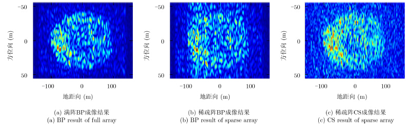 由于单发多收阵列的等效阵长只有满阵的一半,该模式下方位向分辨率较低(约14m),成像结果不易直观反映目标的信息,故本文又给出了多发多收(Multiple Input Multiple Output,MIMO)模式下的成像结果。此时,等效阵长与满阵相同,方位向分辨率为6.8m,成像结果见图 9和图 10。从图中可见,采用本文方法对稀疏阵列成像可达到接近满阵成像的效果。为了更准确地评价本文方法,在此使用均方根误差MSE来比较重建图像的质量。使用真实场景的图像做参考,分别与满阵BP,稀疏阵BP和稀疏阵CS方法的结果进行比较,具体结果见表 2。