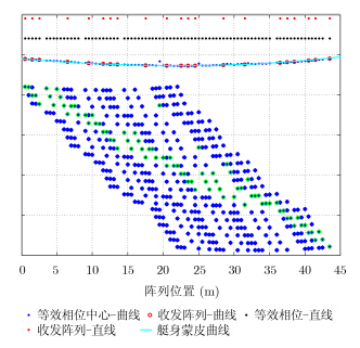 将上述44位巴克码排布的稀疏阵列子阵在直线上的位置(图 3中红色点),分别投影到三叶玫瑰线(蓝色曲线)上,来获得与艇身底部共形的稀疏阵列,根据等效相位中心原则,可获取21组等效相位中心(蓝色点)。天线布局(红色圆点)[5]根据路径差最小的原则,选取对应的等效相位中心(绿色圆点),形成孔径综合后的阵列。其投影方式和阵列布局情况如图 3所示。