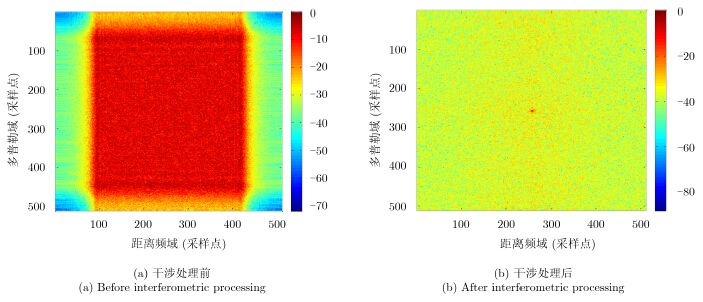 如图 5所示,原始SAR复图像的频谱分布在由信号带宽和多普勒带宽决定的较宽的范围内,频谱是不稀疏的。而进行干涉处理后,由于消除了消除散射单元的随机初相位,其频谱主要集中在零频附近,2维频谱带宽已明显变窄。这说明干涉处理可以实现降低信号带宽的目的。