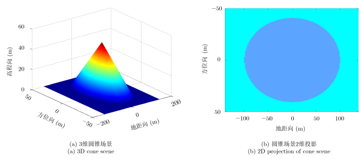 本节给出了仿真数据的成像结果,以验证本文方法的有效性。本节仿真中,采用基于${\ell ^{{\rm{1/2}}}}$范数的最优化方法[16]求解变换域系数,最终获得图像。有关算法求解的具体步骤较为复杂,在此不再赘述,关于算法的复杂度和运算量,可参考文献[17]。图 6显示了仿真场景。在此选用一个包含椭圆锥的场景而非点目标场景(空间稀疏)来进行仿真试验。仿真的圆锥高为50m,椭圆锥长轴为100m,短轴约40m,位于100m×280m(方位×地距)大小的平面上。圆锥的后向散射系数为1,地面的后向散射系数为0.3。仿真采用单发多收模式,第2.1节所述的共形稀疏阵列中第1个子阵发射线性调频信号,其中$f_m$为第$m$个子阵发射信号的中心频率,$k \rm{_r}$为调频率。