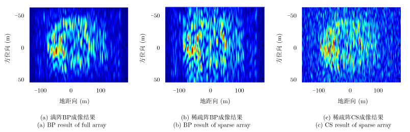 图 7分别显示了单发多收模式下采用满阵(44个子阵)BP成像、稀疏阵列(21个子阵)BP成像和稀疏阵列CS成像的结果。图 8为同样条件下添加噪声后的成像结果,单脉冲信噪比(Signal-to-Noise Ratio,SNR)为10dB。从图中可看出,同样是稀疏阵列,使用CS方法,可以有效地降低旁瓣的影响,而传统的BP方法则不行。虽然仍有一定的副瓣干扰,但使用CS方法在稀疏阵条件下可以获得与满阵接近的效果。