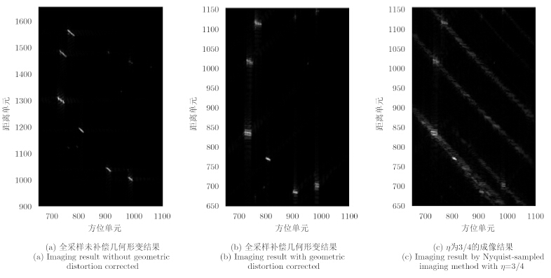为了便于后续分析,本部分首先给出一种基于走动校正的NCS成像算法用以处理全采样回波数据的大斜视SAR成像。将接收到的基频回波信号${s_{\rm{r}}}\left( {\hat t,{t_{\rm{m}}};{R_{\rm{p}}}} \right)$从$\hat t - {t_{\rm{m}}}$域变换到$\,{f_{\rm{r}}} - {t_{\rm{m}}}$域,得到