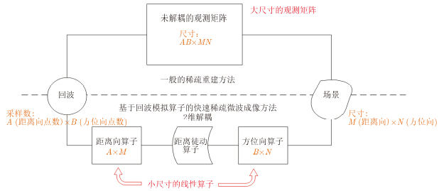 两步迭代算法完全通过数据对相位误差进行估计与补偿,是一种自聚焦算法。参考文献[17]用仿真数据说明了其有效性。但该算法基于正则化模型,由于每个迭代步骤需进行两次子迭代,运算量甚至还高于常用的基于${\ell _1}$正则化的稀疏重建算法。我们知道,稀疏重建算法的复杂度和观测矩阵的规模成平方关系,随着场景尺寸的增加,算法耗时会迅速增加。在实际应用中,问题规模往往会变的十分巨大,导致稀疏重建变得实际上不可能。例如,简单的估计表明,我们如果对尺寸为1024×8192的场景进行稀疏重建,观测矩阵的尺寸会达到107×107级别,运算消耗的内存空间可能达到数十TB级别,时间消耗在一般的工作站上会达到数月至半年。这当然是不可接受的。而基于两步迭代的自聚焦算法,其运算量至少是 ${\ell _1}$正则化算法的两倍。因此,在实际应用中,该方法基本不具有实施的可行性。 3 基于回波模拟算子的快速稀疏微波成像算法
