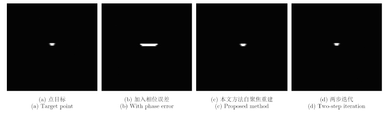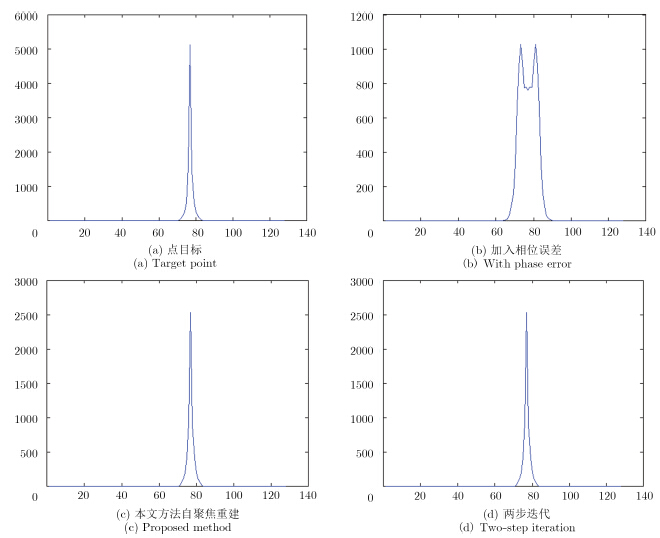 实验场景中设置1个点目标,如图 6(a)所示,点目标的方位向切片在图 7(a)中给出。我们在方位向加入最大为0.15 ${{π}} $的2次相位误差,采用稀疏重建算法得到的含误差的重建结果如图 6(b)所示。特别地,其目标所在距离门的方位向切片在图 7(b)中给出。可以明显看到2次相位误差造成的散焦。在图 6(c)中,我们给出了采用本文所述算法进行自聚焦补偿后的稀疏重建结果,方位向切片在图 7(c)中给出。可以看到,本文所述算法较好地完成了2次相位误差的补偿。在图 6(d)和图 7(d)中,我们提供了两步迭代法的结果进行对比。
