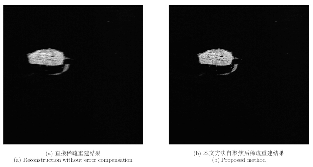 实验结果在图 8中给出。图 8(a)为对存在相位误差的原始数据直接应用基于回波模拟算子的快速稀疏微波成像方法的成像结果;图 8(b)为应用本文自聚焦方法后的稀疏微波成像结果。可以看到,原数据直接成像存在较大的散焦现象。计算得到,此时图像熵值为16.91。而应用自聚焦方法后,成像质量有较大提升,基本实现聚焦,图像熵值也提升为12.93。