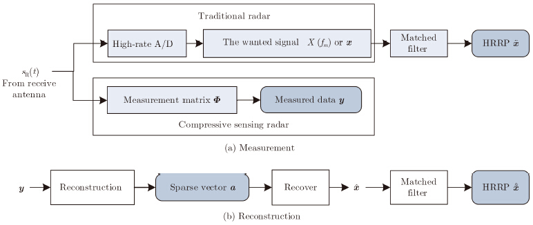 Resolution improvement requires additional radar bandwidth. According to the Nyquist theorem, the sampling rate should be twice of the bandwidth. Due to the limited processing speed and data capacity of hardware, a ceiling is set on the sampling rates. Compressive sensing, a new measurement theory proposed by Donoho et al.[3], indicates that sparse signals can be accurately recovered from lower-rate samplings. Radar signals of targets are sparse, and can be compressively measured and reconstructed[4].