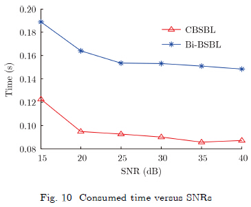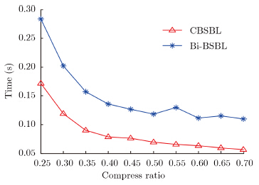 Fig. 9 shows the consumed time of reconstruction versus compression ratios, ρ. Here, we set the SNR as SNR=20 dB. It can be seen that the CBSBL algorithm uses less time than Bi-BSBLunder different compressive ratio levels. Fig. 10 shows the reconstruction cost time versus SNRs. Here, the compressed ratio is ρ=0.35. It is shown that the CBSBL algorithm is less time-intensive than Bi-BSBL under different noise levels.