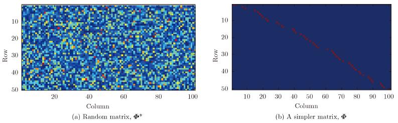 Most existing compressive sensing models take a random matrix $\Phi$*, as shown in Fig. 3(a), as the measurement matrix. In our compressive model, we use a simple measurement matrix $\Phi$, as shown in Fig. 3(b). There is only one non-zero element in each row or each column of matrix $\Phi$. Actually, the measurement matrix shown in Fig. 3 is equivalent to an unequally-space sampling method. It not only reduces size of samplings, but also can relieve the pressure of A/D conversion.