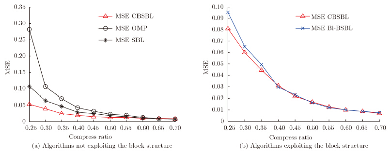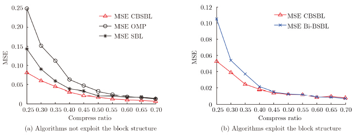 It can be found from Fig. 4(a) that the reconstruction accuracy of CBSBL algorithm is better than the OMP and SBL algorithms. Fig. 4(b) shows that the reconstruction accuracy of CBSBL algorithm is almost the same as the Bi-BSBL algorithm. When the compressive ratio is low, the performance of CBSBL is a little better than the Bi-BSBL. This demonstrates CBSBL and Bi-BSBL, the algorithms exploiting block structure, obtain better signal reconstructions than those that do not.