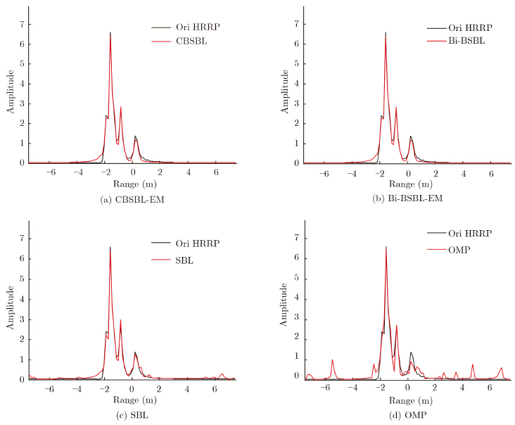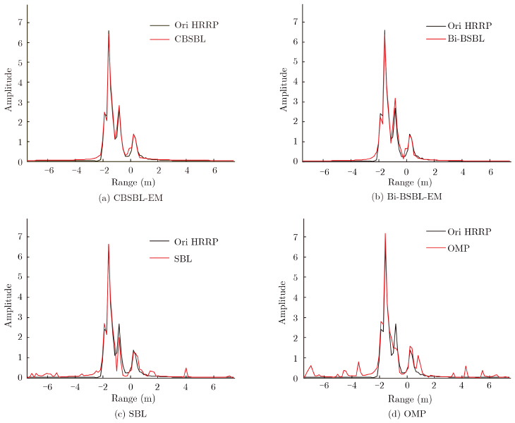 For a straightforward observation, Fig. 5 shows the reconstructed HRRPs of the four algorithms in an experiment trip. Figs. 5(a)~5(d) are the reconstructions of CBSBL algorithm, Bi-BSBL algorithm, SBL algorithm, and OMP algorithms respectively. The reconstructed HRRPs in Figs. 5(a) and 5(b) are more similar to the original signal, while the reconstructed results of SBL and OMP algorithms have obvious waveform distortion. Clearly, the signals are recovered better by CBSBL and Bi-BSBL.