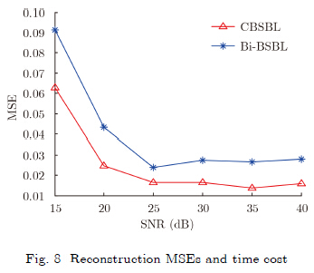 In this subsection, we set ρ=0.35, and add Gaussian white noise to the original signals to let SNR=[15, 20, 25, 30, 35, 40] dB. Then the number of compressive samplings is M=sup(0.35×101)=36. For each fixed SNR, we carry out the compressive measure and reconstruction for Tn=50 trips. The reconstruction MSEs of CBSBL and Bi-BSBL versus SNR are shown in Fig. 8. It can be seen that the reconstruction accuracy of the CBSBL algorithm is a little better than Bi-BSBL under different noise levels.