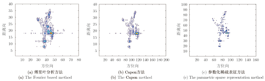 地基ISAR载频5.52 GHz,发射信号带宽400 MHz,脉冲宽度25.6 μs,脉冲重复频率200 Hz。采用参数化稀疏表征的交替迭代更新方法,对不同的输入数据块,经不超过10次迭代,最终估计得到目标转动速度稳定在约0.01 rad/s。图 1给出了傅里叶分析方法、Capon谱估计方法和参数化稀疏表征方法的成像结果,可以明显看到参数化稀疏表征提升了ISAR成像质量。