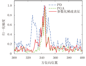 机载SAR载频9.68 GHz,发射信号带宽200 MHz,脉冲宽度15 μs,脉冲重复频率1 kHz。采用参数化稀疏表征的交替迭代更新方法,对不同的输入数据块,经10余次左右迭代,能够准确估计得到雷达载机平台速度。图 2给出了相位差(Phase Difference,PD)方法[31]、相位梯度自聚焦(Phase Gradient Autofocusing,PGA)方法[32]和参数化稀疏表征方法的SAR自聚焦处理结果,图 3给出了图 2中所标注的强散射目标成像结果的方位向剖面图。从图 2和图 3中可以看到:PD方法的成像质量有一定损失,这主要来自于方位向信号相位对消时多个线性调频分量的互相干扰;PGA方法聚焦效果很好,但其性能受聚焦参考点选择、窗长设置等因素的影响较大;参数化稀疏表征方法SAR成像质量可以和PGA方法相比拟,同时避免了参考点、窗长等因素的复杂影响,实际可操作性更强。