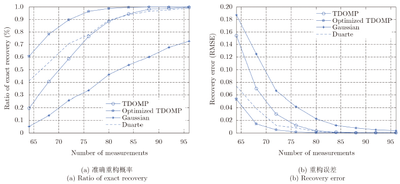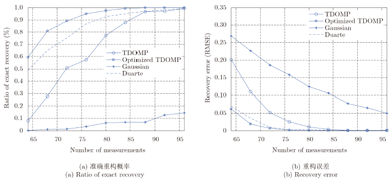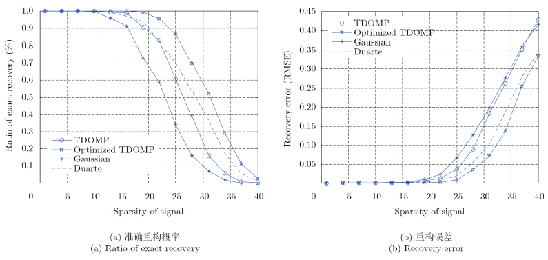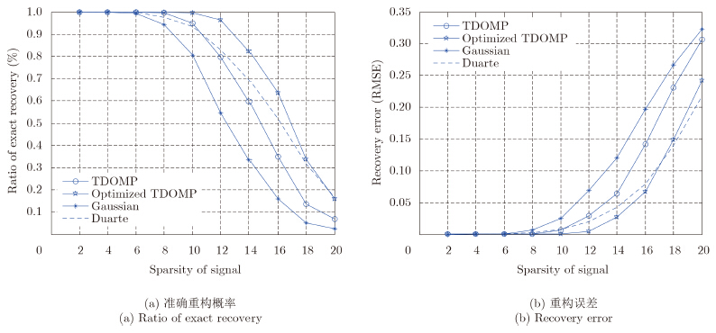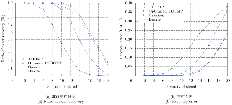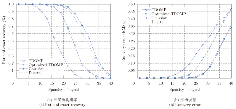 ![]() | 图 5 高斯稀疏基下OMP和TDOMP算法重构高斯稀疏系数的性能比较 Fig.5 The performance comparison of recovering Gaussian sparse coefficients by using OMP and TDOMP with Gaussian sparse basis |