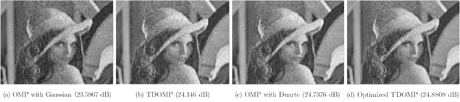 图 10中,图 10(a)为采用高斯随机测量矩阵下OMP的仿真结果,图 10(b)为采用高斯随机测量矩阵下TDOMP的仿真结果,图 10(c)为采用Duarte[10] 所提优化测量矩阵下OMP的仿真结果,图 10(d)为采用本文所提优化测量矩阵下TDOMP的仿真结果,测量矩阵优化情况下的TDOMP称为Optimized TDOMP。从图 10可以看出,TDOMP算法对图像的重构效果好于OMP算法的重构能力,而对于TDOMP算法,测量矩阵优化后对图像的重构效果好于没有优化的测量矩阵的重构效果。但优化测量矩阵对TDOMP算法重构性能的提高程度不如优化测量矩阵对OMP算法重构性能的提高程度。