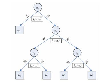 对某个样本进行决策树分类时,从根节点n0开始,对样本的f0特征进行测试,根据测试结果f0>a0,将样本分配到其子节点n1,依次递归进行测试和分配,直到叶子。而在决策树的训练和建树分支操作中,有一个重要的概念是“纯度”,其含义为,若节点所包含的全部样本均为同种类别标记,则称该节点是“纯”的,决策树的分支操作也就结束了,节点变为叶子;“纯度”的度量方法有很多,例如采用熵、方差、分类错误概率等形式[7]。现有的决策树建树算法包括ID3、C4.5与CART等[7],采用的思想是一致的,也就是使分支操作所带来的“纯度”增益最大;而它们的节点采用的都是单个特征。具体来说,分支操作前,节点ni的单个特征fi及其相应阈值ai均未知。此时需要一一考察特征集F中的每一个特征fk(k=1,2,···,m);测量当前节点所包含的全部样本的fk特征值,遍历所有相邻两数值的中间值,作为fk的候选阈值待定;而单个特征fi及其相应阈值ai的最终确定遵从的是“纯度”增益最大原则。fi和ai的确定,标志着节点ni分支操作的完成。对于整棵树来说,需要设置“纯度”增益门限来停止分支,以及采用多数规则来判断叶子的最终所属类别。因此,这些算法的分支停止需要依赖门限值,并且会出现过拟合,需要剪枝算法[7]来提升推广性。