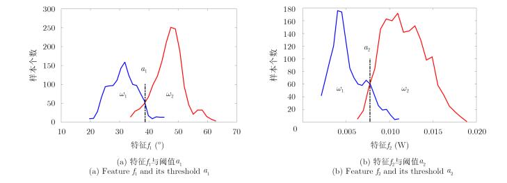 当采用单个极化特征fi(i=1,2,···,l)时,样本的分布情况是通过直方图来描述的。选取AIRSAR-Flevoland数据中的两类样本,分别用蓝色与红色表示,图 2(a)统计了它们的散射角f1的取值分布,图 2(b)统计了它们的HH通道后向散射功率f2的取值分布。在直方图中采用阈值ai(i=1,2),可以将样本划分为w1和w2两类,即w1:fi≤ai,w2:fi>ai(i=1,2)。然而,由于两类样本的散射机制相似、极化特征值的分布出现混叠,无论怎样调节阈值都无法避免分类错误。